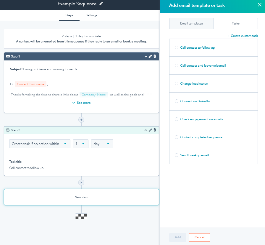 The first template you create is the email you want to have a response to in the first hand. If your contact doesn’t reply to your first email, the second template comes into use. You decide when you want the second email to be sent to a contact. When a contact replies to your email or books a meeting using your HubSpot meeting link, the sequence terminates. Each sequence is limited to five email templates, although you can add as many task reminders as needed.